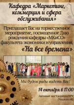 13.10.2015 08:35 Кафедра "Маркетинг, коммерция и сфера обслуживания" приглашает на мероприятие, посвященное дню кафедры!!