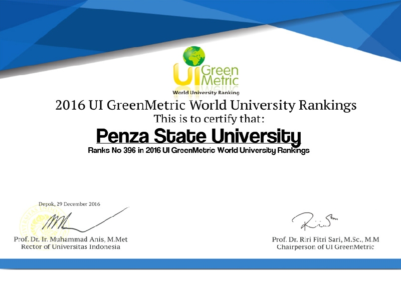 ПГУ вошел в топ мировых вузов, которые стремятся внести свой вклад в улучшение состояния окружающей среды и экологической безопасности посредством интеграции новейших достижений науки и техники в стратегию энергоэффективности кампуса, экосистему города, области и страны. Пензенский государственный университет занял 396 место. Количество вузов, принявших участие в данном рейтинге, возросло с 407 до 516 университетов из разных стран мира, что говорит о его глобальном характере.