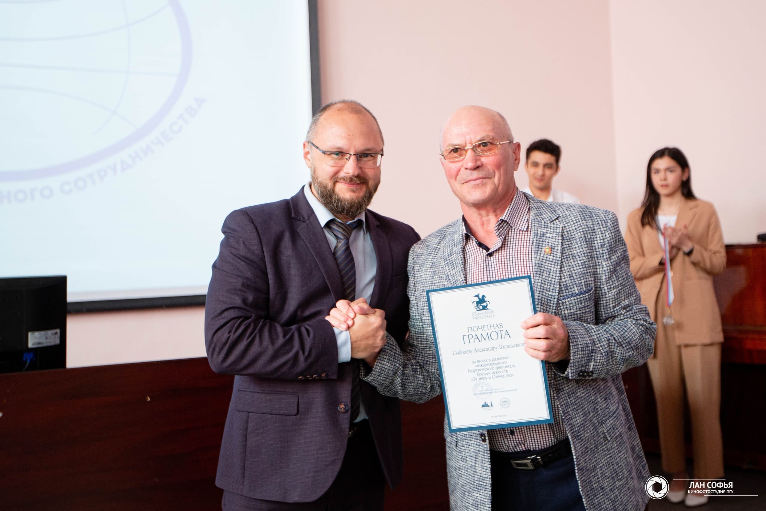 Благодарственные письма проректора по международной деятельности ПГУ за помощь в организации и проведении спортивно-оздоровительного мероприятия для иностранных студентов «Игры доброй воли» были вручены преподавателям: Елене Дворяниновой, Марии Крапчиной, Антону Симакову и Александру Соболеву. Александр Васильевич был также награжден почетной грамотой за вклад в развитие международного Георгиевского фестиваля боевых искусств «За Веру и Отечество».
