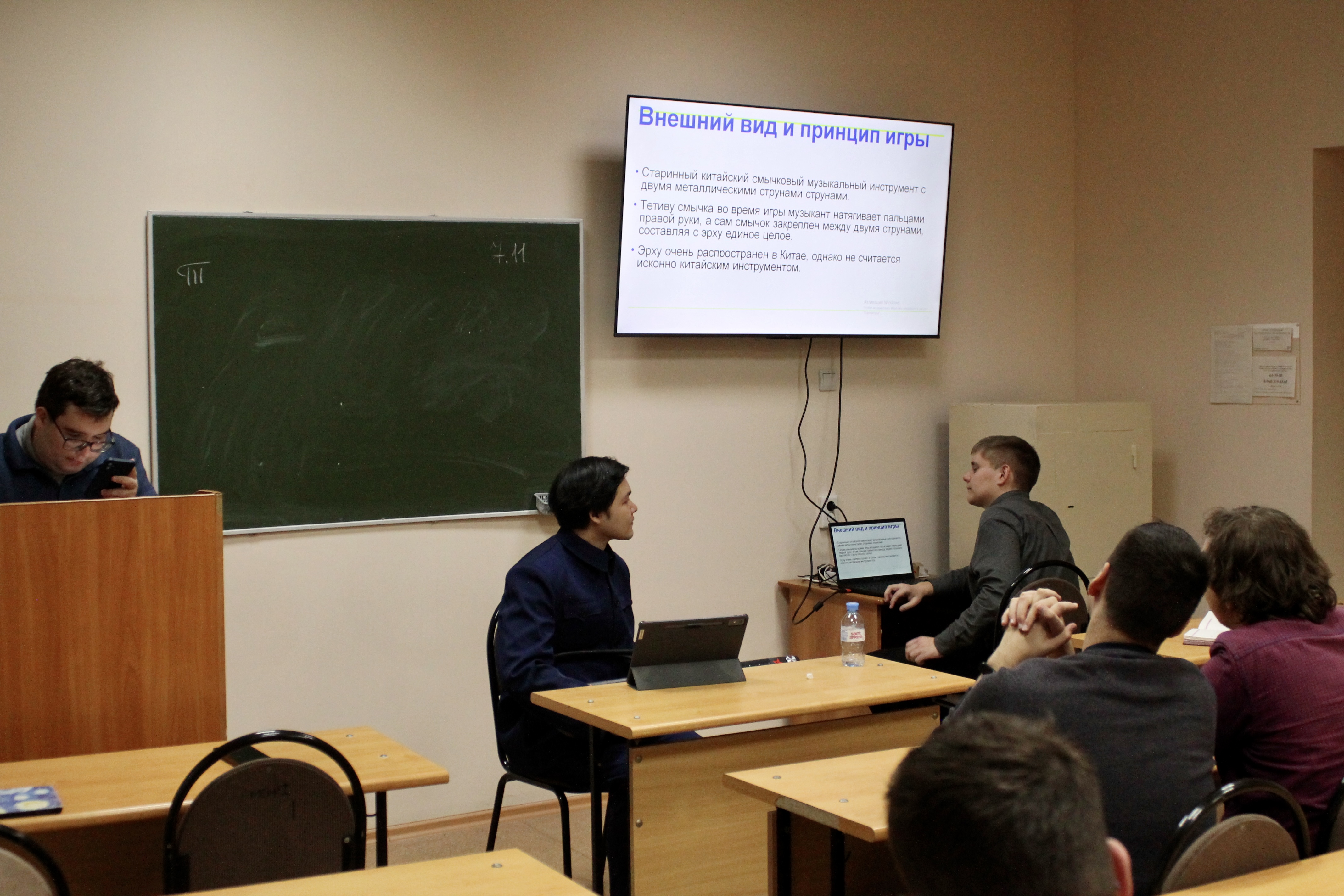 Затем с докладом о китайских традиционных китайских музыкальных инструментах выступил магистрант Нижегородского государственного лингвистического университета имени Н. А. Добролюбова, выпускник Педагогического института имени В. Г. Белинского ПГУ Михаил Тесленко. Он рассказал об истории эрху и гуциня. Члены кружка услышали звучание этих инструментов как в записи, так и вживую. Во время доклада произведение «Бегущий конь» на эрху исполнил студент Лю Ичуань.
